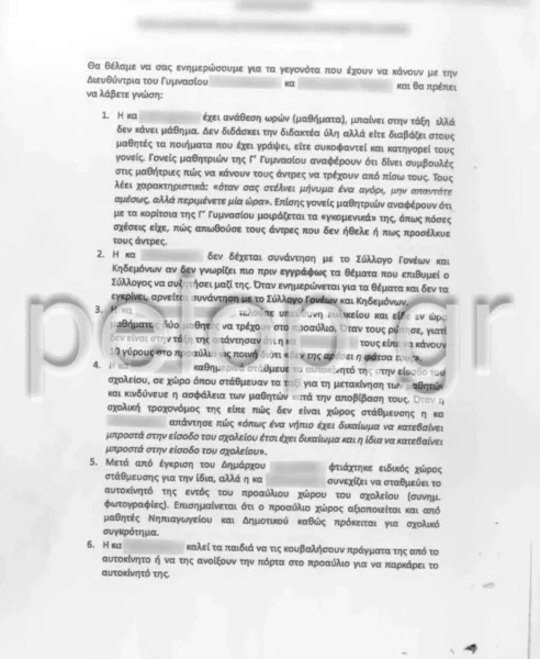 Οι γονείς, μέσω του Συλλόγου Γονέων και Κηδεμόνων, έχουν ήδη απευθυνθεί στην ίδια με στόχο την παύση αυτών των ταπεινωτικών πρακτικών, χωρίς όμως να υπάρξει αποτέλεσμα. Σύμφωνα με τις καταγγελίες, η διευθύντρια φέρεται να κάνει συστηματικό ψυχολογικό εκβιασμό, να γράφει προσβλητικά σχόλια για μαθητές και να ζητά από τους γονείς να υπογράφουν δηλώσεις υποστήριξης προς το πρόσωπό της.