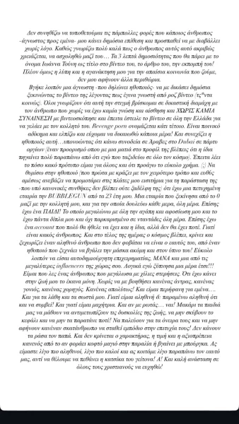 Είναι ποινικό αδίκημα και ελπίζω και εύχομαι να δικαιωθώ κάποια μέρα! Και συνεχίζει η ηθοποιός αυτή… υπονοώντας ότι κάνω συνοδεία σε Άραβες στο Dubai σε πάρτι οργίων (έναν προορισμό όπου με μια ματιά στο προφίλ της βλέπεις ότι η ίδια πηγαίνει πολύ παραπάνω από ότι εγώ που ταξιδεύω σε όλο τον κόσμο). Έπειτα λέει το πόσο κακό πρότυπο είμαι για όλους και ότι προάγω το εύκολο χρήμα (;) Θυμίζω στην ηθοποιό που πρώτα με κράζει με τον χειρότερο τρόπο και ευθύς αμέσως ανεβάζει να προμοτάρει στις πλάτες μου εισιτήρια για τη παράσταση της (που υπό κανονικές συνθήκες δεν βλέπει ούτε ξαδέρφη της) ότι έχω μια πετυχημένη εταιρία την BUBBLEGUN από τα 23 έτη μου.