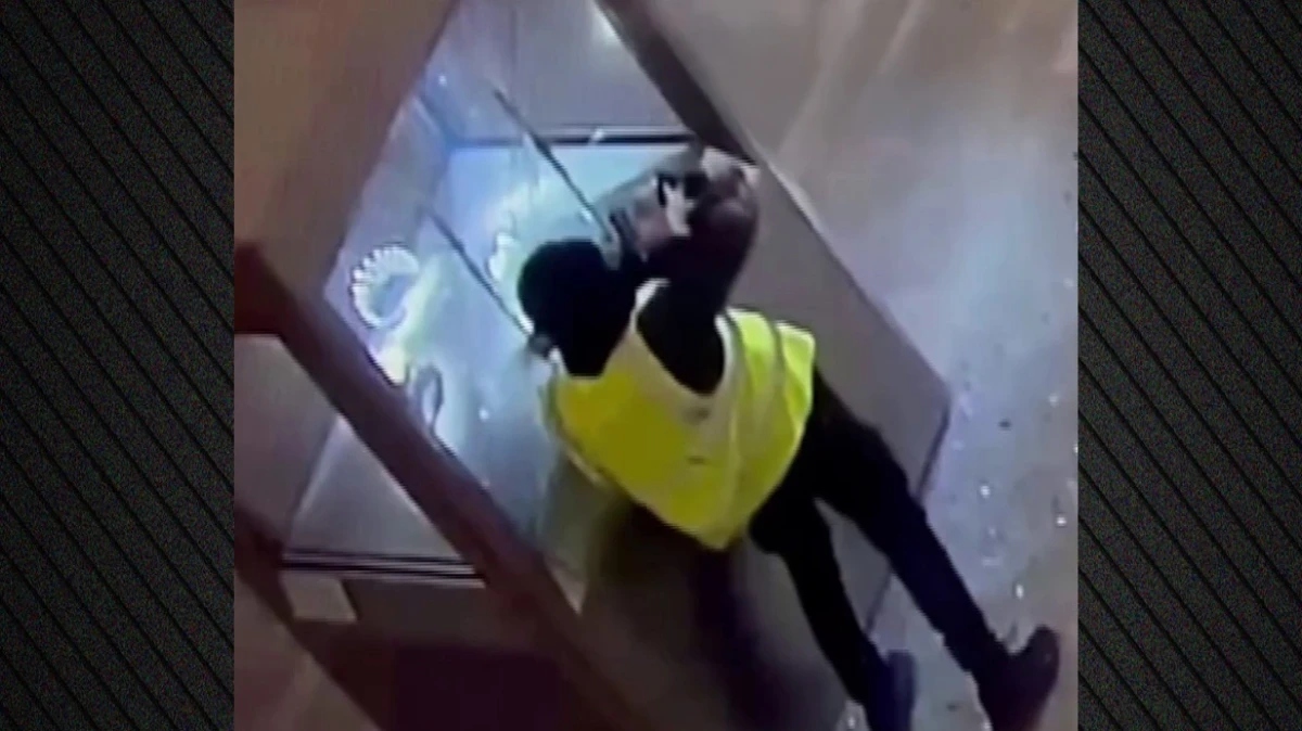 Φορώντας κίτρινο γιλέκο και ντυμένος στα μαύρα, κατευθύνεται στη συνέχεια προς τον συνεργό του για να τον βοηθήσει να διαλύσουν και δεύτερη προθήκη, προκειμένου να αφαιρέσουν περισσότερα πολύτιμα αντικείμενα.