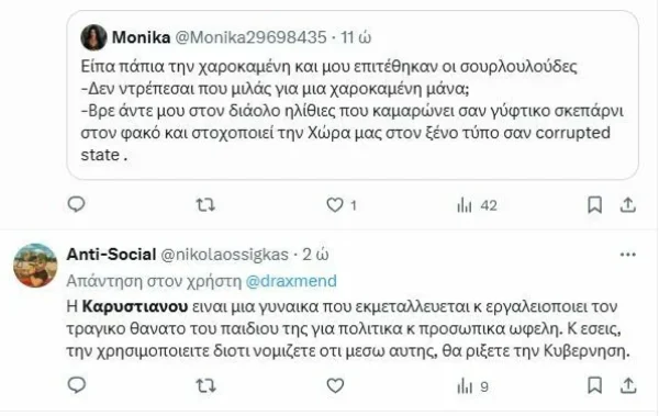 Σφοδρή επίθεση από τα «τρολ» στο twitter δέχεται η Μαρία Καρυστιανού που έχασε την κόρη την κόρη της, Μάρθη στο σιδηροδρομικό δυστύχημα που στοίχησε τη ζωή σε 57 θύματα μετά τη συνέντευξη που έδωσε στους Sunday Times.