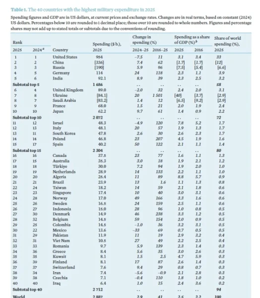 Παράλληλα, ο πόλεμος στην Ουκρανία συνεχίζει να τροφοδοτεί τη στρατιωτική κούρσα, με Ρωσία και Ουκρανία να διαθέτουν τεράστιους πόρους στην πολεμική προσπάθεια, ενώ οι Ηνωμένες Πολιτείες, παρά προσωρινή μείωση δαπανών, θεωρείται πιθανό να επανέλθουν σύντομα σε ακόμη υψηλότερα επίπεδα.