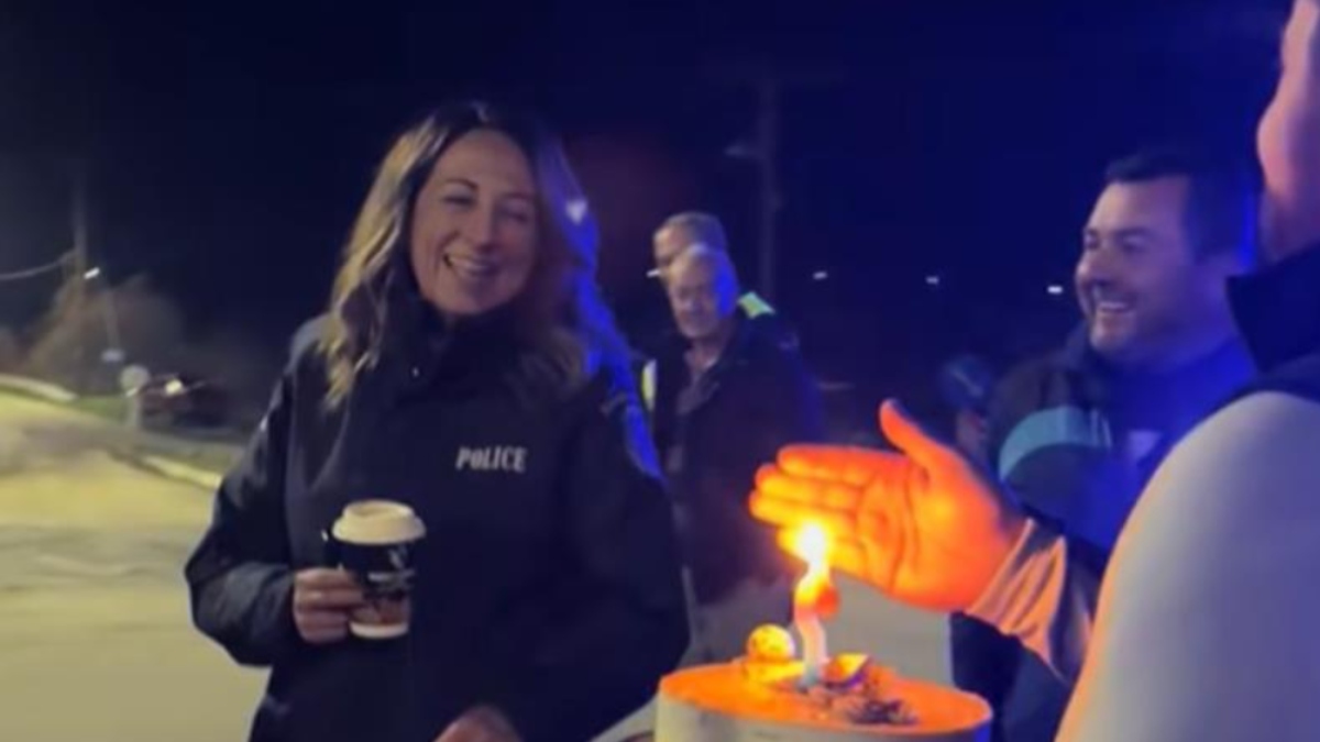 Οι αγρότες, μαζί με τους παρευρισκόμενους συναδέλφους της αστυνομικού, της τραγούδησαν το τραγούδι των γενεθλίων, κι εκείνη έσβησε το κεράκι κι έκανε την ευχή της.