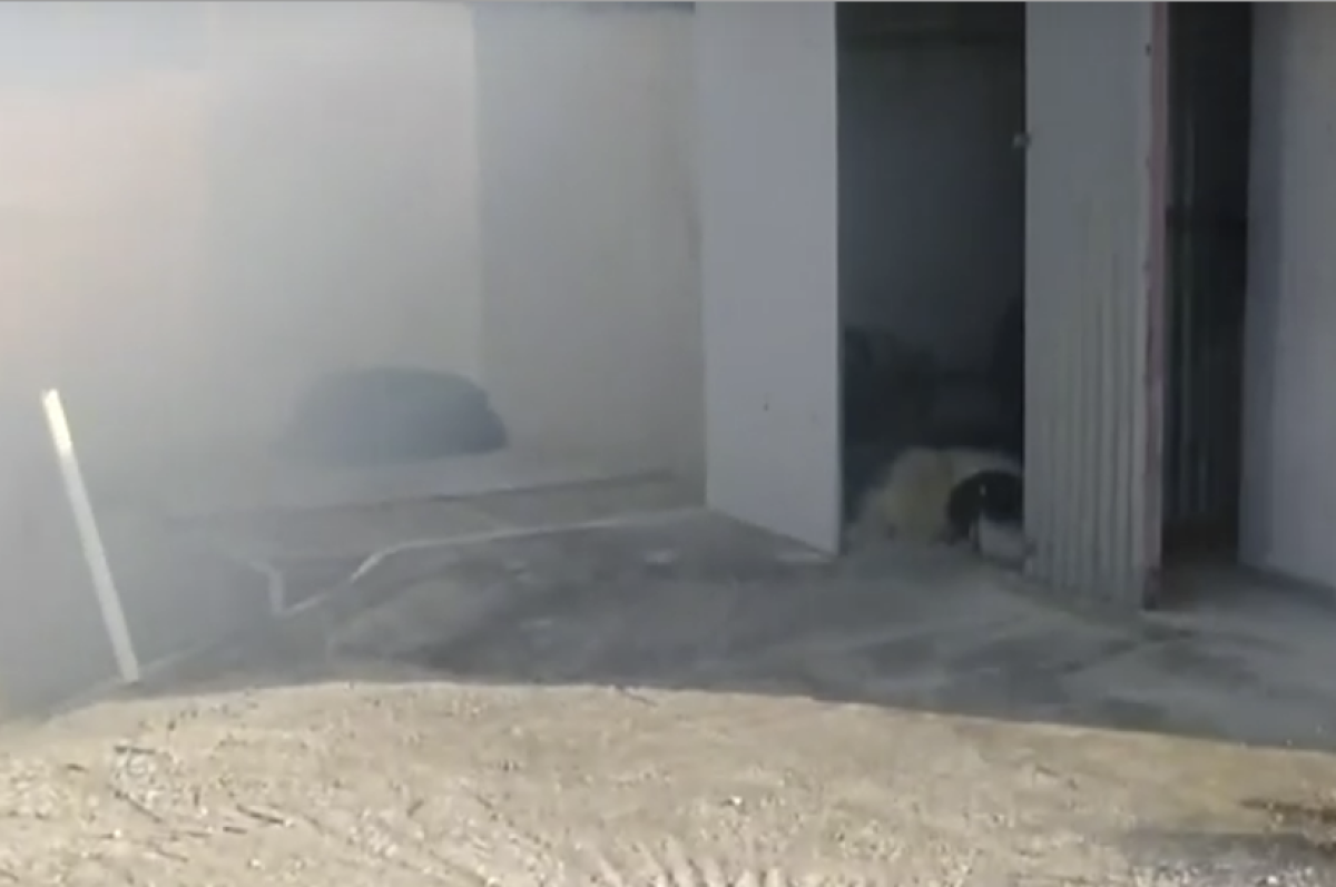 Στο βίντεο, ο εθελοντής φαίνεται να μπαίνει στην αποθήκη όπου είναι εγκλωβισμένο το σκυλάκι. Παρά τον παντού καπνό και τις φλόγες που μαίνονται στη γύρω περιοχή, δεν παραιτείται από την προσπάθειά του και τελικά τα καταφέρνει.