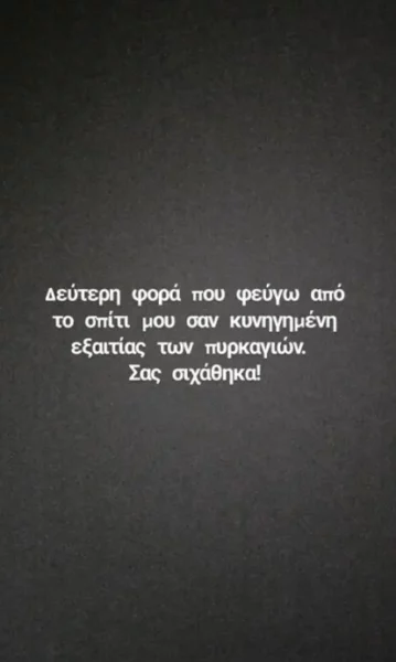 «Δεύτερη φορά που φεύγω από το σπίτι μου σαν κυνηγημένη εξαιτίας των πυρκαγιών. Σας σιχάθηκα» έγραψε στο instagram της φανερά αγανακτισμένη η Μαντώ Γαστεράτου η οποία ζει με την οικογένειά της στα βόρεια προάστια.