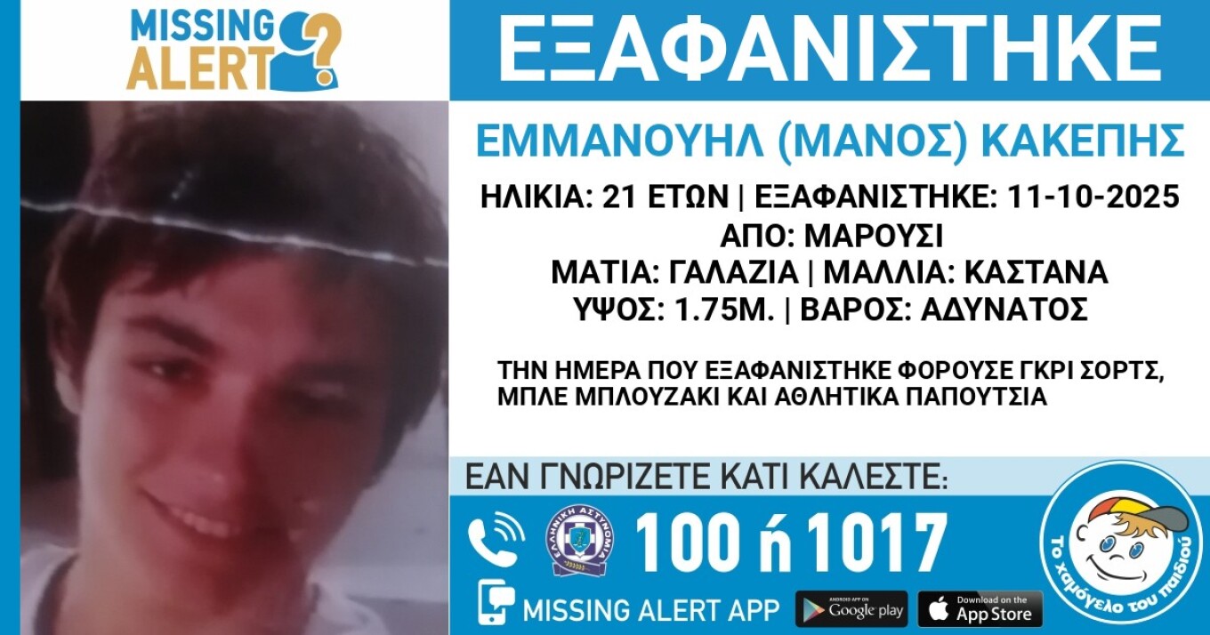 Συναγερμός έχει σημάνει για την εξαφάνιση ενός 21χρονου από την περιοχή του Αμαρουσίου, με το «Χαμόγελο του Παιδιού» να δίνει στη δημοσιότητα τα στοιχεία του, έπειτα από αίτημα της οικογένειάς του.