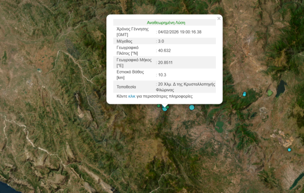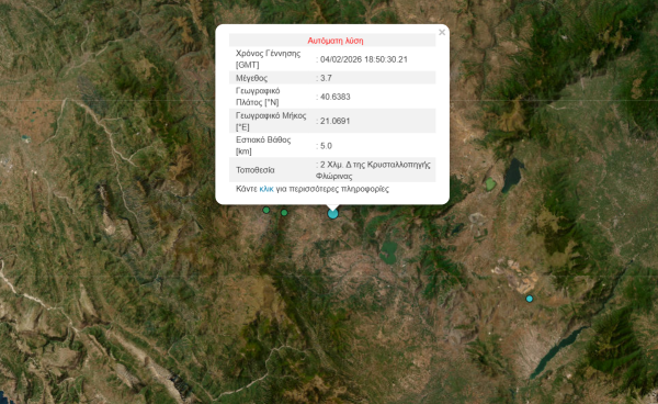 Σεισμική δόνηση μεγέθους 3,7 βαθμών της κλίμακας Ρίχτερ σημειώθηκε το βράδυ της Τετάρτης (04.02) στη Φλώρινα.