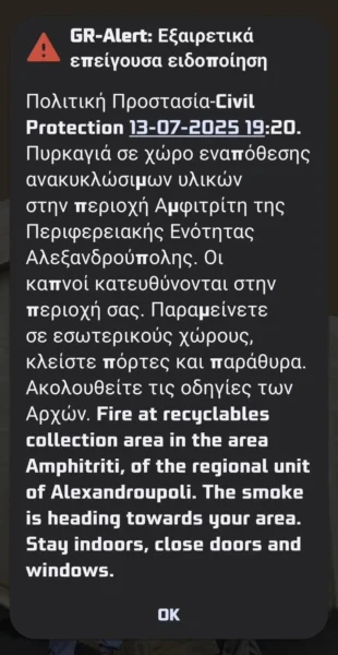 Σημειώνεται ότι πριν λίγο εστάλη και μήνυμα 112 στους κατοίκους της περιοχής για επικίνδυνους καπνούς λόγω της φωτιάς. Συγκεκριμένα, οι κάτοικοι καλούνται να παραμείνουν σε εσωτερικούς χώρους με κλειστές πόρτες και παράθυρα και να ακολουθούν τις οδηγίες των Αρχών.