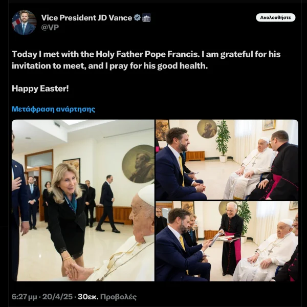 Μάλλον δεν έπιασαν οι ευχές του αντιπροέδρου των ΗΠΑ, JD Βανς στον Πάπα Φραγκίσκο, αφού λίγες ώρες μετά, απεβίωσε.