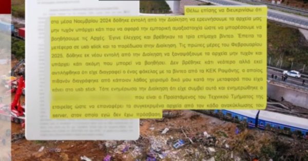 «Θέλω να διευκρινίσω πως στα μέσα Νοεμβρίου του 2024 δόθηκε η εντολή από τη Διοίκηση να ερευνήσουμε τα αρχεία μας μην τυχόν υπάρχει κάτι που αφορά την εμπορική αμαξοστοιχία ώστε να μπορέσουμε να βοηθήσουμε τις Αρχές. Έγινε ο έλεγχος και βρέθηκαν τα τρία επίμαχα βίντεο. Έπειτα τα μετέφερα σε usb stick και τα παρέδωσα στη Διοίκηση.
