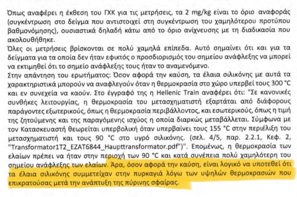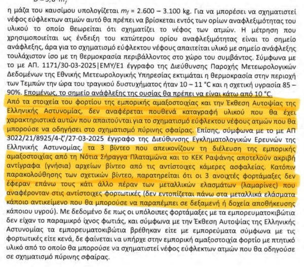 Παράλληλα σύμφωνα με τα μετεωρολογικά δεδομένα, την ώρα του δυστυχήματος η θερμοκρασία στην περιοχή των Τεμπών ήταν μεταξύ 10-11°C με σχετική υγρασία 85-90%. Επομένως, για να σχηματιστεί εύφλεκτο νέφος ατμών, θα απαιτούνταν υλικό με σημείο ανάφλεξης κάτω από 10°C. Ωστόσο, τα έλαια σιλικόνης έχουν πολύ υψηλότερο σημείο ανάφλεξης (άνω των 300°C), καθιστώντας αδύνατο τον σχηματισμό πύρινης σφαίρας υπό τις συνθήκες που επικρατούσαν.