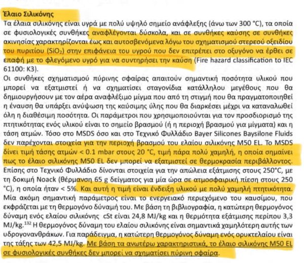 Η επιλεκτική ανάγνωση του πορίσματος και η παράβλεψη της σαφούς διατύπωσης του καθηγητή ότι «το έλαιο σιλικόνης M50 EL σε φυσιολογικές συνθήκες δεν μπορεί να σχηματίσει πύρινη σφαίρα» αλλά και ότι «τα έλαια σιλικόνης πιθανόν συμμετείχαν στην πυρκαγιά λόγω των υψηλών θερμοκρασιών που επικρατούσαν μετά την ανάπτυξη της πυρόσφαιρας» δεν εγείρει απλά πλήθος ερωτημάτων, αλλά επιβεβαιώνει την προσπάθεια αποπροσανατολισμού και συσκότισης!