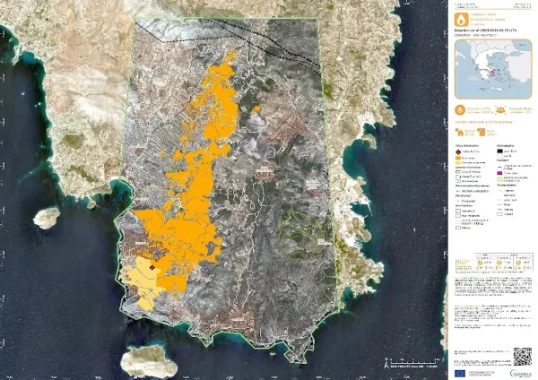 Στην εικόνα του Copernicus η πληγείσα έκταση και με κίτρινο χρώμα η πυρκαγιά που είχε εκδηλωθεί στις 26/6/2025 στο Θυμάρι.
