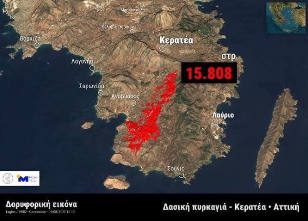 Σύμφωνα με την ανάλυση των δορυφορικών δεδομένων του ευρωπαϊκού μηχανισμού Copernicus EMS, έως και 12:19 είχαν καεί περίπου 15.808 στρέμματα δασικών και χορτολιβαδικών εκτάσεων στις περιοχές μεταξύ Κερατέας και Αναβύσσου.