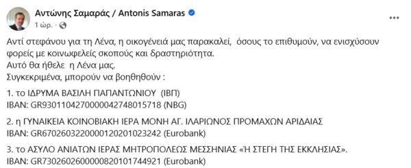 Λίγες ώρες αργότερα, ο κ. Σαμαράς απηύθυνε μια συγκινητική έκκληση: αντί στεφάνων, η οικογένεια ζητά από όσους επιθυμούν να τιμήσουν τη μνήμη της να συνεισφέρουν οικονομικά σε κοινωφελείς οργανισμούς και ιδρύματα. Όπως υπογράμμισε, αυτή ήταν η τελευταία επιθυμία της κόρης του.