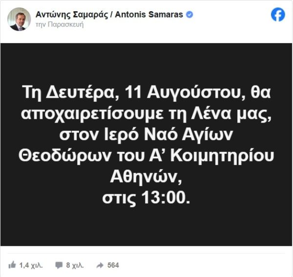 «Τη Δευτέρα 11 Αυγούστου, στις 13:00, θα αποχαιρετήσουμε τη Λένα μας στον Ιερό Ναό Αγίων Θεοδώρων του Α’ Κοιμητηρίου Αθηνών», ανέφερε χαρακτηριστικά.