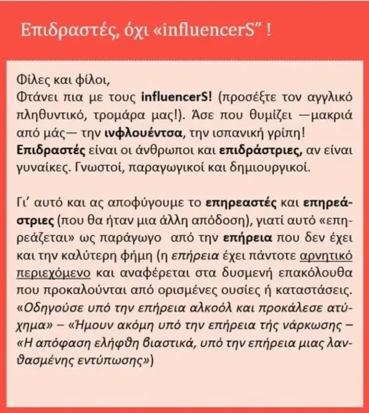 Φτάνει πια με τους influencerS! (προσέξτε τον αγγλικό πληθυντικό, τρομάρα μας!). Άσε που θυμίζει —μακριά από μάς — την ινφλουέντσα, την ισπανική γρίπη!