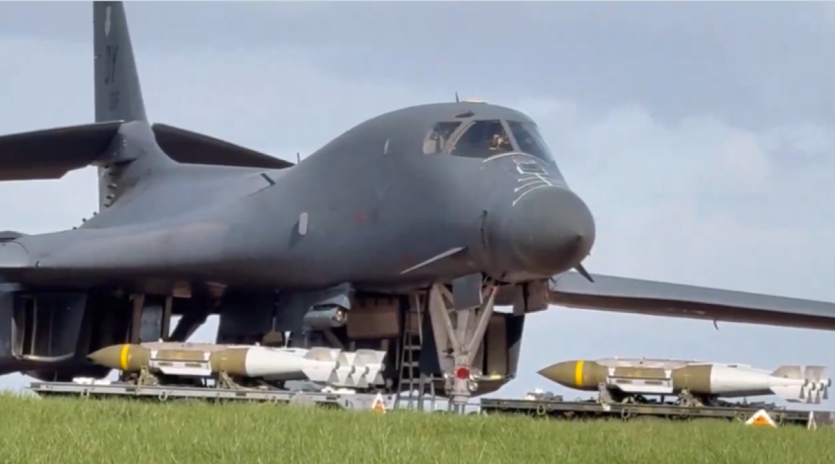 Στο υλικό διακρίνεται προσωπικό εδάφους της Πολεμικής Αεροπορίας των ΗΠΑ να εργάζεται κάτω από τις καταπακτές ενός βομβαρδιστικού B‑1B Lancer, ενώ δίπλα στο αεροσκάφος φαίνονται να βρίσκονται όπλα που μοιάζουν με πυραύλους κρουζ.