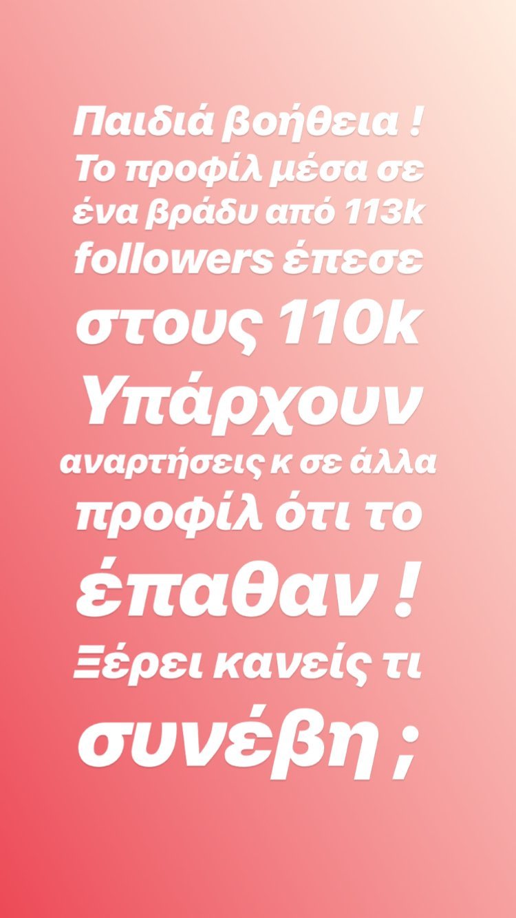 Kάτι περίεργο συνέβη χθες το βράδυ με το instagram. Συγκεκριμένα αρκετά πρόσωπα της showbiz που έχουν χιλιάδες followers, ξύπνησαν σήμερα με κάποιες … χιλιάδες λιγότερους! Το περίεργο γεγονός εντόπισαν οι ίδιοι κοιτώντας το προφίλ τους και το δημοσιοποίησαν στους λογαριασμούς τους στο … instagram! Ανάμεσα σ΄αυτούς η Μαίρη Συνατσάκη, η Πάολα και η Josephine και σίγουρα πολλοί ακόμα…