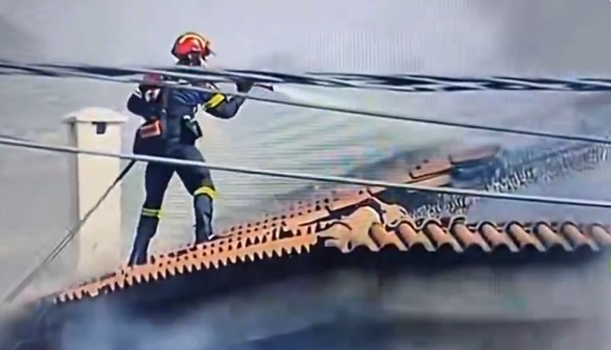 Πυροσβέστης με κίνδυνο της ζωής του σκαρφαλώνει σε κεραμιδένια στέγη, για να τα βάλει με τις φλόγες στη μεγάλη φωτιά της Παλαιάς Φώκαιας, σκηνικό που απαθανατίστηκε σε βίντεο smartphone, το οποίο και έγινε viral.