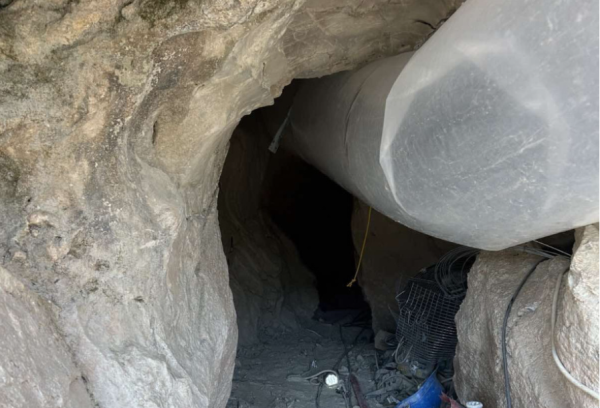 Στη φωτογραφία φαίνεται η σπηλιά που είχε εγκλωβιστεί ο 53χρονος, αλλά και η κατασκευή με τις νάιλον σακούλες η οποία χρησιμοποιείται ως εξαερισμός προκειμένου να έχουν φρέσκο αέρα εντός της σπηλιάς.
