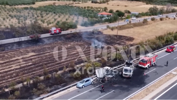 Πίσω τους ήρθε με μεγάλη ταχύτητα το φορτηγό με τον οδηγό να μην προλαβαίνει να αντιδράσει με αποτέλεσμα να σημειωθεί η σφοδρή σύγκρουση και την εκδήλωση φωτιάς.