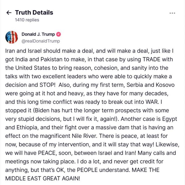 Ο πρόεδρος των Ηνωμένων Πολιτειών, Ντόναλντ Τραμπ, επανήλθε σήμερα με νέα δήλωση μέσω της πλατφόρμας Truth Social, εκφράζοντας την αισιοδοξία του για άμεση επίτευξη κατάπαυσης του πυρός μεταξύ Ισραήλ και Ιράν.