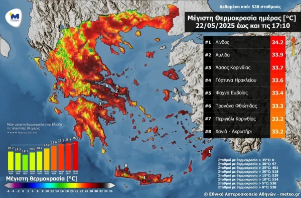 Υψηλές θερμοκρασίες σημειώθηκαν στην ανατολική και τη νότια χώρα την Πέμπτη 22/05, όπως παρουσιάζεται στη χρωματική κλίμακα θερμοκρασιών του παρακάτω Χάρτη, όπου σύμφωνα με το δίκτυο αυτόματων μετεωρολογικών σταθμών του Εθνικού Αστεροσκοπείου Αθηνών / meteo.gr, 97 μετεωρολογικοί σταθμοί κατέγραψαν μέγιστες θερμοκρασίες άνω των 30 °C.