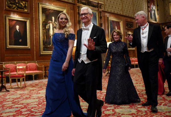 Στο Κάστρο του Ουίνδσορ, το βράδυ της Τετάρτης, παρουσία περίπου 150 προσκεκλημένων, μεταξύ των οποίων ο πρίγκιπας και η πριγκίπισσα της Ουαλίας, επιχειρηματίες όπως ο Τιμ Κουκ και ο Ρούπερτ Μέρντοχ, καθώς και ανώτατοι αξιωματούχοι από το Ηνωμένο Βασίλειο και τις ΗΠΑ, το βασιλικό ζεύγος της Βρετανίας υποδέχθηκε την απαστράπτουσα, μέσα στο κίτρινο, «off shoulder» φόρεμά της, και μία λιλά ζώνη στη μέση, Μελάνια, και τον Ντόναλντ Τραμπ.