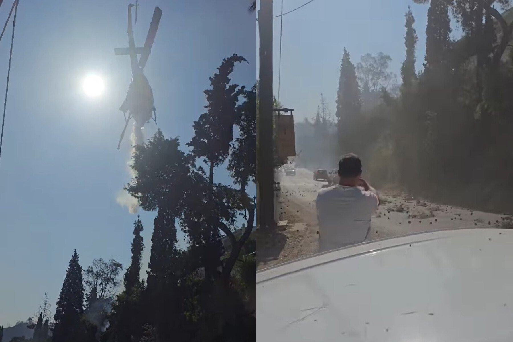Ένα ελικόπτερο επιχειρεί ρίψη νερού στην φωτιά στην Πάτρα, με τον ισχυρό στροβιλισμό του αέρα να προκαλεί πτώση κλαδιών πάνω σε διερχόμενα αυτοκίνητα.