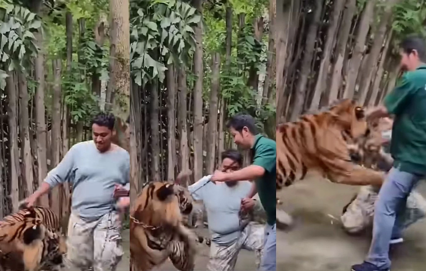 Στο βίντεο, ο άνδρας εμφανίζεται να περπατά δίπλα στην τίγρη κρατώντας την από αλυσίδα, πριν σκύψει για να φωτογραφηθεί μαζί της. Τη στιγμή που τοποθετεί το χέρι του στην πλάτη της, το ζώο αντιδρά βίαια και του επιτίθεται.