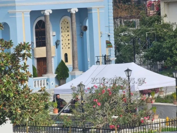 Νωρίτερα, σκύλος ανίχνευσης εκρηκτικών υλών ερεύνησε τον προαύλιο χώρο, διασφαλίζοντας ότι το περιβάλλον είναι απολύτως ασφαλές. Παράλληλα, drone της Αστυνομίας πετούν πάνω από την περιοχή, επιτηρώντας διαρκώς τον χώρο καθ’ όλη τη διάρκεια της τελετής.