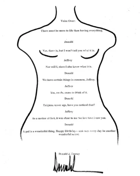 Το «βιβλίο γενεθλίων», το οποίο είχε επιμεληθεί η Γκισλέιν Μάξγουελ, περιείχε ευχές από δεκάδες γνωστούς, συνεργάτες και φίλους του Έπσταϊν, όπως ο Μπιλ Κλίντον. Ορισμένα μηνύματα ήταν τυπικές ευχές, ενώ άλλα περιείχαν σεξουαλικά υπονοούμενα ή σκίτσα. Ο Τραμπ εμφανιζόταν στην ενότητα «Φίλοι», μαζί με άλλες προσωπικότητες της εποχής.
