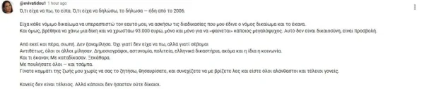 Αρχικά, το μοντέλο έγραψε: «Ό,τι είχα να πω, το είπα. Ό,τι είχα να δηλώσω, το δήλωσα, ήδη από το 2006. Είχα κάθε νόμιμο δικαίωμα να υπερασπιστώ τον εαυτό μου, να ασκήσω τις διαδικασίες που μου έδινε ο νόμος δικαίωμα και το έκανα. Και όμως, βρέθηκα να χάνω μια δίκη και να χρωστάω 93.000 ευρώ, μόνο και μόνο για να “φαίνεται” κάποιος μεγαλόψυχος. Αυτό δεν είναι δικαιοσύνη, είναι προσβολή. Από εκεί και πέρα, σιωπή. Δεν ξαναμίλησα. Όχι γιατί δεν είχα να πω, αλλά γιατί σέβομαι. Αντιθέτως, όλοι οι άλλοι μίλησαν. Δημοσιογράφοι, αστυνομία, πολιτεία, ελληνικά δικαστήρια, ακόμα και η ίδια η κοινωνία. Και τι έκαναν; Με καταδίκασαν. Ξεκάθαρα. Με πουλήσατε όλοι και τσάμπα. Γίνατε κομμάτι της ζωής μου χωρίς να σας το ζητήσω, θησαυρίσατε, και συνεχίζετε να με βρίζετε λες και είστε όλοι αλάνθαστοι και τέλειοι γονείς».